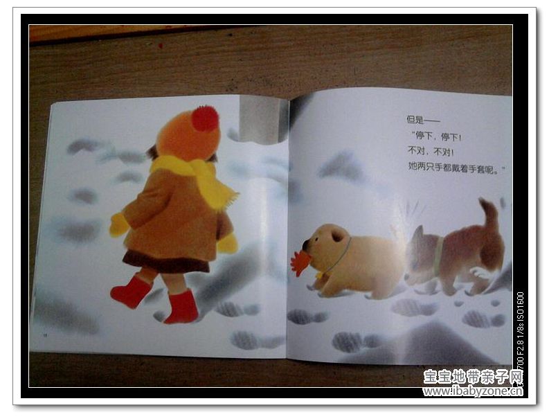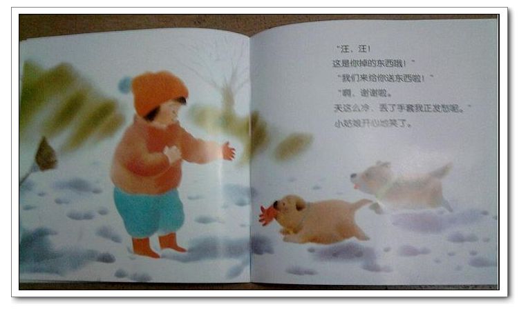 哈哈,小狗很聪明,不是,小朋友两只手都戴着手套。这里感觉有点bug,小朋友的手套明明是黄色的,与小狗嘴里橘色的不一样,书上却说是一样的颜色。我讲的时候略过一样二字了,因为宝宝对颜色比较敏感。