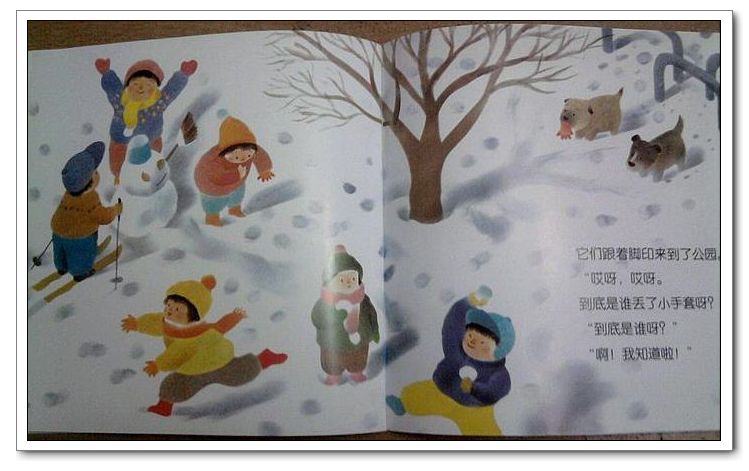 他们在雪地里发现了一只棉手套,看到它在哪里了吗?它是什么颜色的?