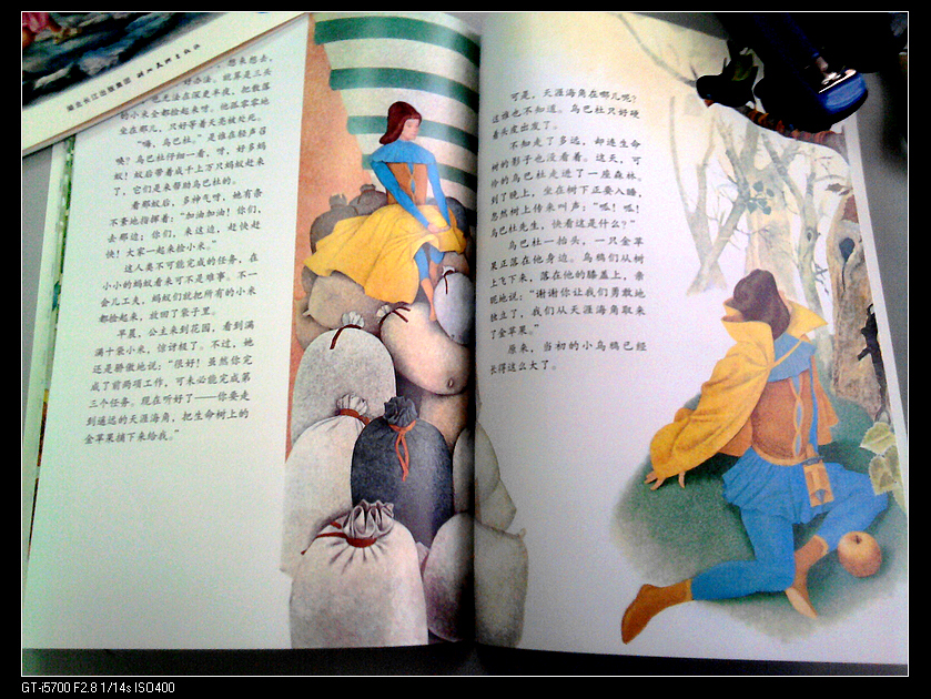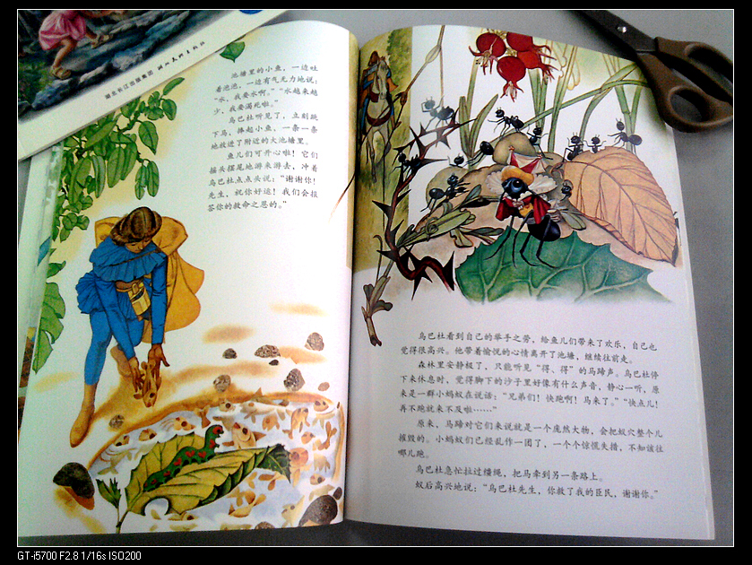 不会认字有不会认字的好处,你讲的时候,他的注意力会放在被捏住脖子嘎嘎而叫的鸭子身上(被胖厨师抓在手中时,脖子的扭向、脸部的肌肉都清晰可见);会放在温顺的马儿身上;会放在仓促逃窜的蚂蚁身上(蚁王的表情惊慌失措);会放在三只可爱的小乌鸦身上(简单可爱)……附带说一句,那位公主垂着头的画像真是温柔娴静,极具美感(就是我感觉头上的白布很像绷带,那个姿势也有点像在拿手机发短信……嘿嘿嘿)