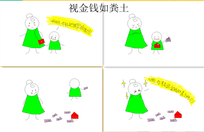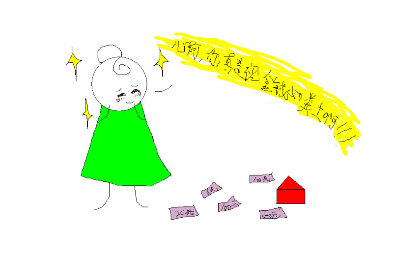 宁宁每次拿着每个人的钱包,都是把里面的钱全部撒在地上,1块的,5快的,10块的,100的。。满地都是,然后他冷眼瞅一瞅躺在地上的钱,不屑一顾的转头走开,这种视金钱如粪土的品德值得我们大人去学习,不要为了钱而累死累活。 这是俺应妈妈需求上的山寨版:
