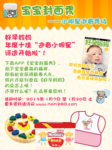 迎新春,拍靓照,上杂志,抢大礼!好2013年1月7日至1月20日,参加“宝宝封面秀——小明星迎春秀场”活动,送你“好孕”新春大礼。