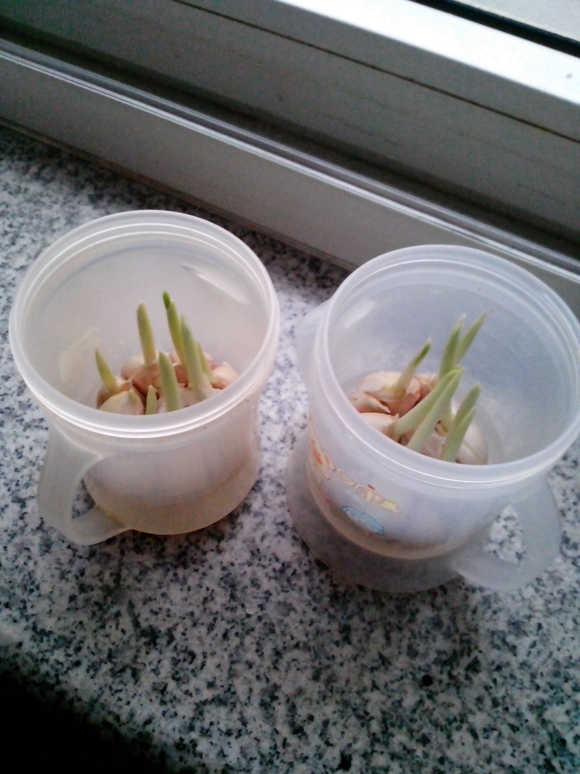 我下班回到家,一看到窗台上怎么多了两个圆溜溜的小东西,还以为是水仙或者是风信子。仔细一看才知道,原来是两头大蒜。