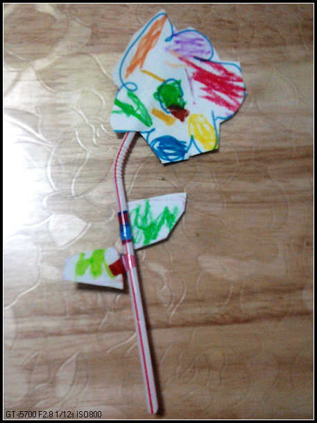 宝宝剪纸的能力有了提高,前两天剪了个圆形,比较圆。上星期宝宝画了朵彩色的花,心血来潮自己剪了下来,拿来让我看。正好桌子上放着枝吸管,我鼓励她把叶子也剪下来,粘在吸管上。很漂亮的花,宝宝拿着摇来摇去,不知道插在哪里好。