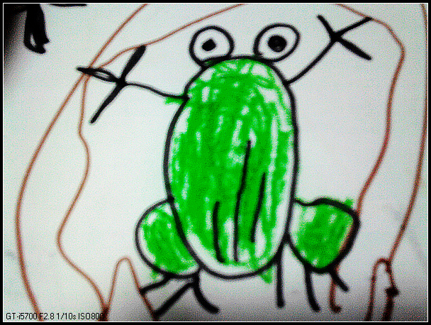 宝宝模仿的能力也有了很大的提高,这只青蛙就是她自己照着图画书画的,外面的圈圈是荷叶……
