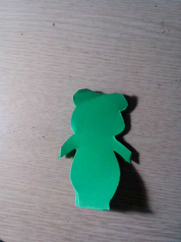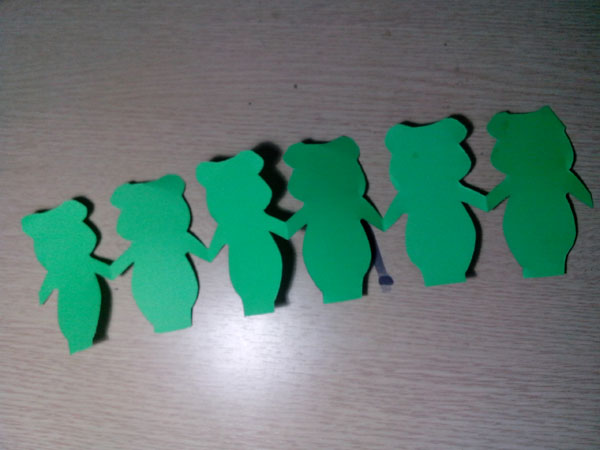 第三步:剪出一个小熊的形状。(其实喜欢剪什么都可以,只要自己喜欢就行。)注意,手臂的末端不要剪开,是要连接其他小熊的。