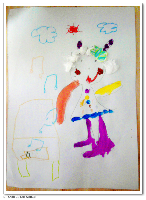 画完美羊羊,我问婷,美羊羊在做什么呀?婷说,她在跳舞。然后给旁边画上了椅子,椅子上放置MP3,还飘出了音符……