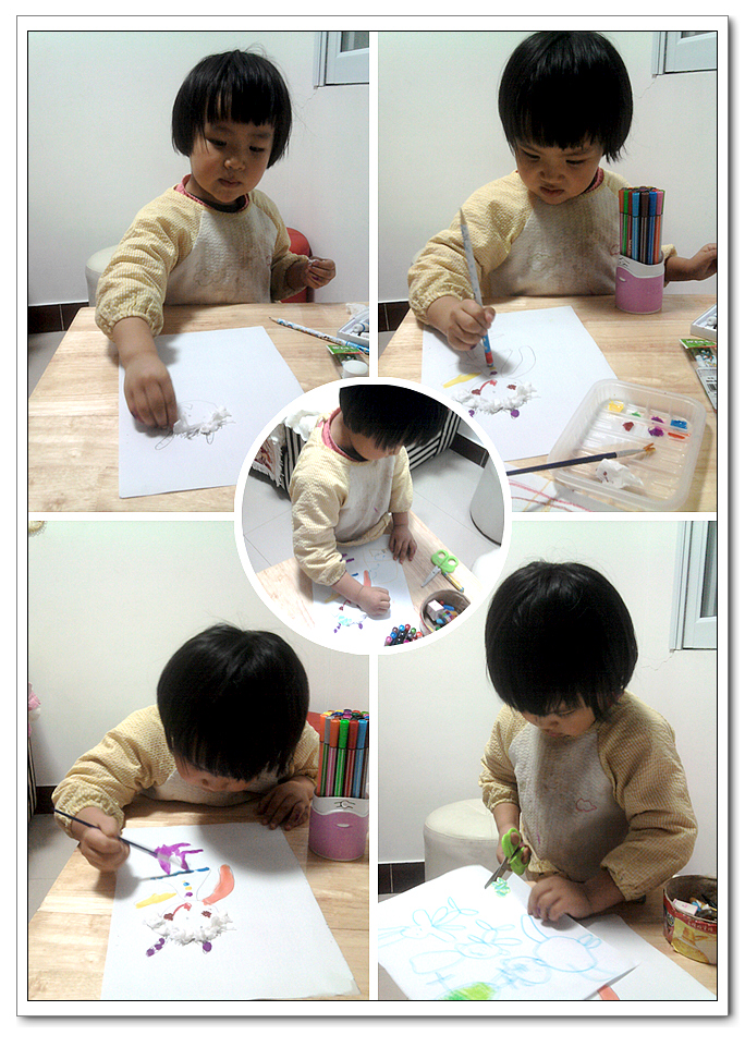有铅笔(昨天拿回来,婷翻出来,大爱,执意拿它作画),有彩笔,有蜡笔,有剪刀,有橡皮,有双面胶。
