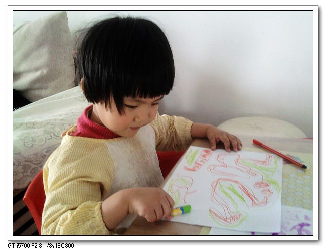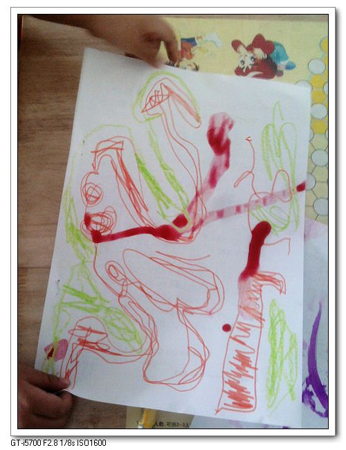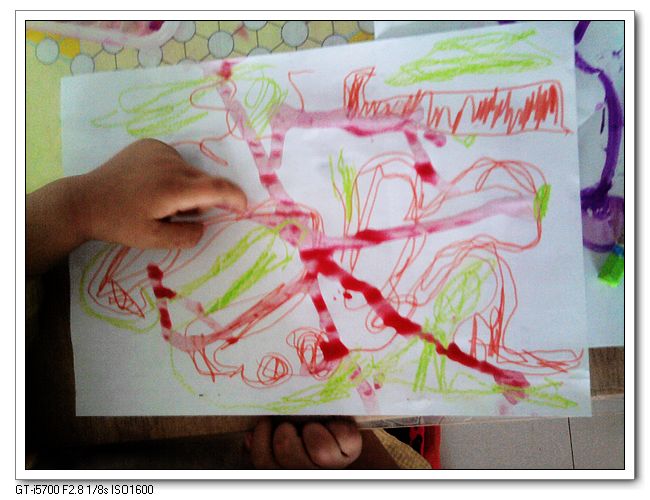 让婷先在纸上用蜡笔画一些图案,本来是像做截断用的。可惜婷根本不听我指挥,用她喜欢的水彩笔随意涂抹,不过还是在我的提示下,用绿色的蜡笔画了些草地。