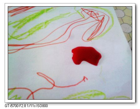 拿颜料画画来着,婷不小心把颜料洒在了纸上,我看到水马上就要流到桌子上了,赶紧去抢救(流到桌子上,老公肯定会骂滴)。看着水流来流去,忽然想到一个主意。