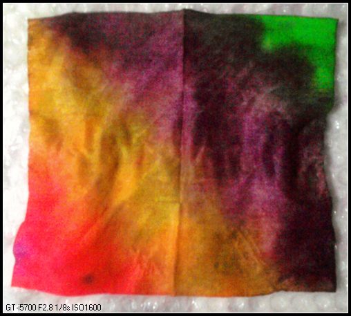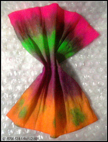颜色是用食用色素调的,为怕着色效果不好,特意多滴了几滴,结果好像倒多了,颜色出来很深啊。取了几块湿巾,用不同的方法折叠,扎好,然后让婷分别去蘸颜色。可能是由于蘸得过多,我感觉没出来我想像的效果。不过她开心就好。