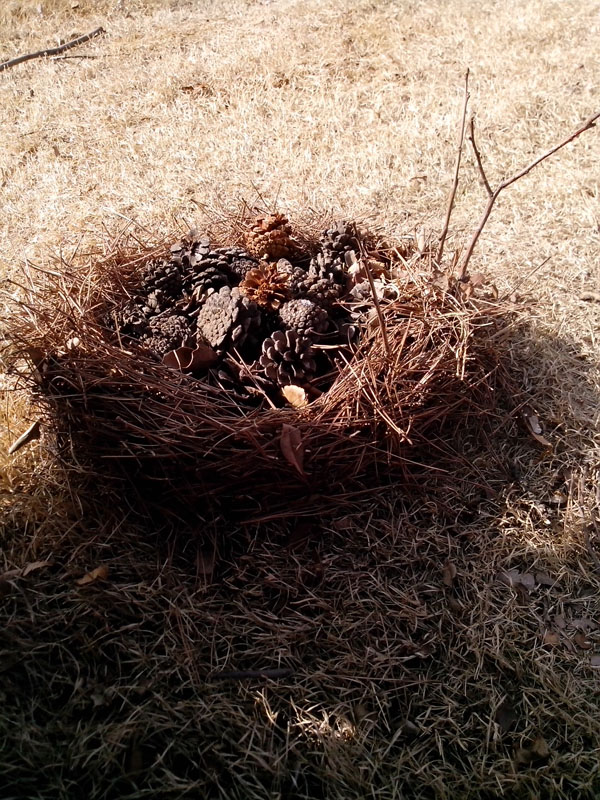 收集了足够多的松树枝回来,爷爷用手稍微一拢,一个好看的鸟窝就诞生了。女儿说:“我要在鸟窝里放上鸟爸爸、鸟妈妈、鸟爷爷和鸟奶奶。”女儿很兴奋地到处去找小石头,充当小鸟。但是小石头都掩藏在草堆里,不容易发现,倒是一个一个的松球随处都是,女儿捡了一个,又发现一个,忙得不亦乐乎。