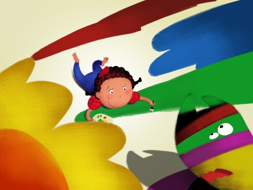 故事中大量的运用了一些纯色系,例如红色、黄色、蓝色、绿色等,这些可都是小朋友平时画画经常用到的颜色噢,试着点一点,看看小米会用这些颜色画出哪些美丽的图画呢?