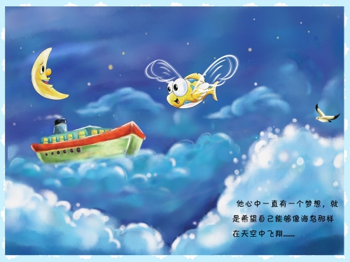 4岁以上幼儿阅读的互动亲子读本。每个人都有属于自己的梦想,而梦想如何能实现则需要自己的努力,有一条鱼他名叫小小鱼,他也有一个梦想,就是能像海鸥那样在天空中飞翔。小小鱼为了能够实现自己的梦想,每天努力着练习飞翔,直到有一天,他终于鼓足勇气向海面冲去……后来,小小鱼每天都会练习飞翔,他的努力与成功感染了其他的小伙伴们。