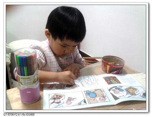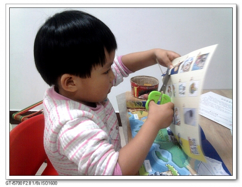 贴纸书,我所爱也;剪贴书,我一样喜欢。婷用剪刀的能力已经很不错,看了一下书,就知道应该剪那个,自己去取了剪刀和胶棒来,我只需要在一旁笑而不语。
