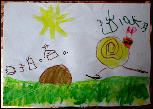 我喜欢这本书,是因为它的画风(作者秋山匡,代表作《鸡蛋哥哥》),颜色干净漂亮,充满春天的气息;画面简洁活泼,孩子极易模仿。于是,清明节的下午,外面细雨丝丝,我们不能出门,就看着婷在家里临摹这张《啪嗒啪嗒蜗牛》。阴冷天气里,挡不住春意浓浓。字和年龄也是婷写的,虽然歪歪扭扭,却与画面颇合。