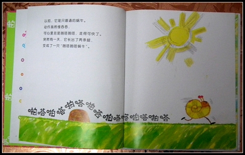 就是一只蜗牛长出了脚,然后它啪嗒啪嗒的走着,超过了乌龟,超过了小鸡,甚至超过了小兔。小兔问它 ,蜗牛先生,你要去哪里呀?蜗牛猛然醒悟——我只是出来散步,为什么要走得那么快?于是休闲、活动、锻炼,然后施施然回家。