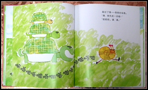婷却很是喜欢。也许是喜欢作者的想象力——蜗牛长出了腿;也许是喜欢那摞在一起的乌龟三口;也许是喜欢那只呼呼睡觉的小猪;也许只是喜欢妈妈不停重复“啪嗒啪嗒"。2个多星期了,每天都要讲,讲完后还要求玩一遍。