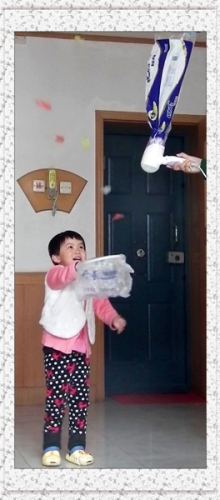 婷这几天老是跟我说,小蝴蝶留下了一些种子,过一段时间,就会变成漂亮的蝴蝶,翩翩飞舞。于是想起这个游戏来。果然很好DIY,我们一切从简了。因为怕伤头发,这吹风机在我家只此时方显大用。懒得糊套子了,老爸找出一只刚好用完的卫生纸袋子绑了上去。蝴蝶也好找得很,用彩色的塑料袋和皱纹纸剪了几只,即使不用风机,站在沙发上飘下来,也让婷兴奋了许久。