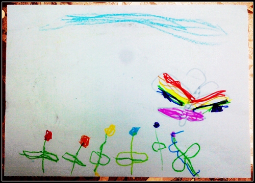 白蝴蝶飞过彩色的花后,变成了彩色的蝴蝶——想法来源于《我的超级想像书》,给婷讲了一遍,那天突然自己画了出来。