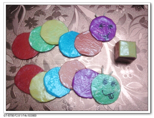2.弄12个圆形(原版应该是各7种颜色,就是14个了,而且原版虫子的身体是月牙形的,我简化了),贴上不同的颜色,做成2条毛毛虫。