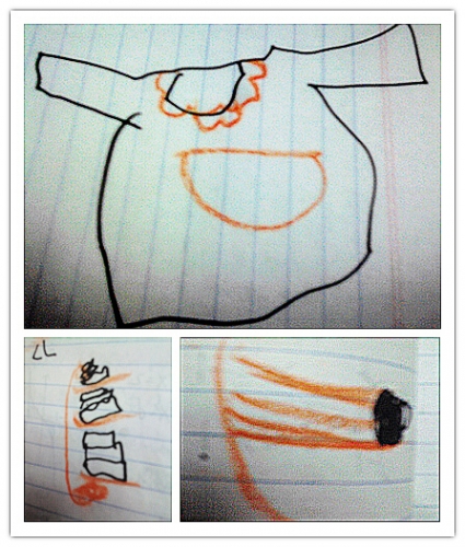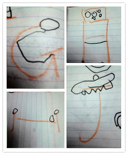 这就是那个让我惊喜的G,是一个小板凳,后面有灯,还能防止人摔倒(现在看挺像一个坐着读书的人);H原来想得是摇椅,下面还画了摇椅的弧形腿,后来又说像冰箱,里面装着食物;I像床,床上有床头和枕头;J像雨伞,雨伞有花边;