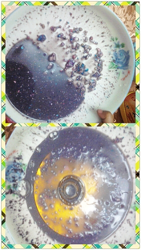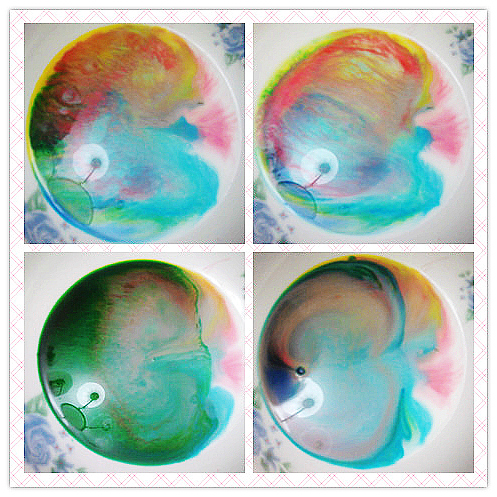 倾斜盘子,可以看到牛奶的结块物,染上颜色,像糖针。婷把光盘放进盘子,给我变魔术——瞧,光盘不见了;又把光盘压下去,看形成的小气泡,还要求我给气泡拍照;又把手在纸上抹了抹,道手指画。
