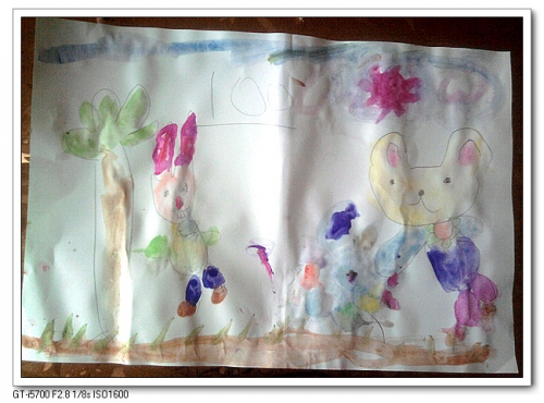 顺便把婷昨日画的一幅画记录,她给自己打了100分。