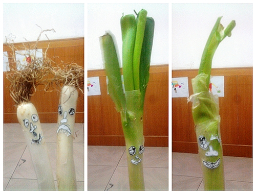 跟婷在厨房玩儿,看到两棵大葱。取了回来,做小人。