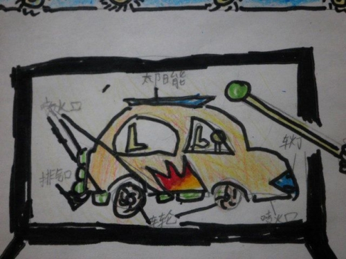 这是Colin小朋友设计的喷气式汽车。他说:未来空间会很挤,地面上难以承载车来车往的压力,所以我的汽车有个排气口,可以通过燃气发动机,发动能量,从而能够上天。嘿嘿,愿他的梦想能够实现,帮我们解解压力,哈哈......