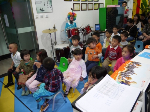 小朋友们都乖乖坐着等机器人表演噢!旁边就是会敲鼓的机器人,他会根据播放的音乐敲鼓呢!