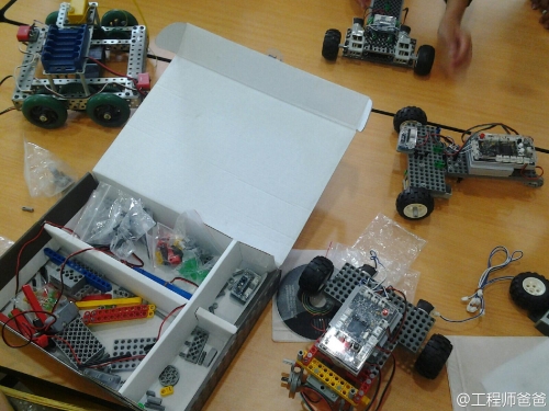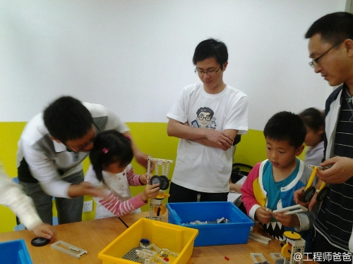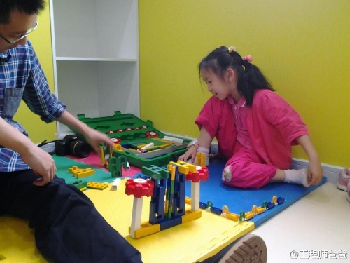 这是力学和机械组。工程师爸爸站在一边看着工程师妹妹组装机械机器人。爱就是陪伴提示,不代替孩子思考,让孩子自己成长。