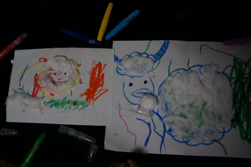 3.手工——制作小绵羊。道具,棉花、蜡笔、纸、胶水。小朋友画得很开心,在家长指导下制作小绵羊。请看图片:
