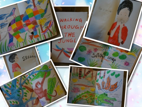 前段时间群里分享了一本好书——《walking through the jungle》,因为没抢购上,几乎所有的网站都没有货,怎么办?为了让宝宝尽快读到这本好书,我利用了一个晚上和一个下午,对照视频画了一遍。这可是一个功夫活,要先把白纸一张一张首尾相连,然后正反折成手风琴状,然后慢慢画,并且配上文字。据说这本书有三个版本,那么我给宝画的就是全世界第四个版本了,呵呵。在绘画过程中,我会对原书稍微进行改编,例如其中的大象我画成了宝宝喜欢的绘本造型——花格子大象艾玛。这样,让宝宝在看这本书时会感到很熟悉。