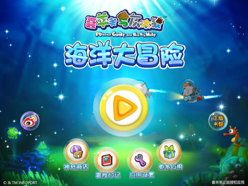一打开这款应用,就出现了海底世界的漂亮背景,海底咕噜咕噜地冒着气泡,喜羊羊和灰太狼在海底游来游去,耳边响起的是熟悉的喜羊羊主题曲,特别有看动画片的感觉。