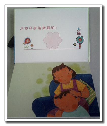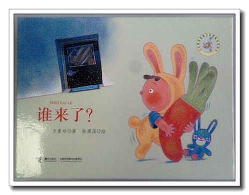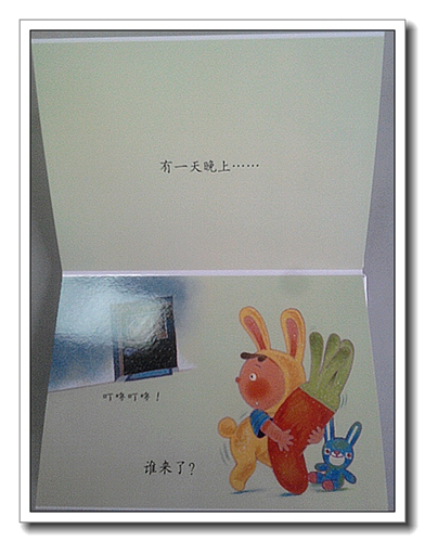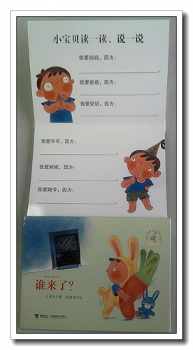 《谁来了》是一本折叠翻页书,横着看,向上翻开。没有用订书针装订,安全结实。可以像手风琴似的拉开,比我的手臂还长,我拉开合上拉开合上,想起了扑克魔术。这样的书籍可以跟宝宝一起DIY,让宝宝动手动脑,做一本自己的书,即使宝宝太小不会画,也可以剪贴一些东西上去,让她拿在手里玩儿。封面的宝宝穿着一身兔兔服,是婷的最爱,旁边一只蓝色的小兔子,跟我们星期天做的手工有点像。翻开内页,封二上画着可爱的图案,写着“这本书送给亲爱的——”。翻过书来,后面有“小宝贝读一读、说一说”,让宝宝说明为什么爱妈妈爸爸等,留了空间给家长,为宝宝做个记录。