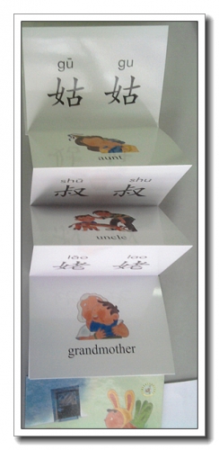 4.书的背面是认知卡片,有故事中出现的家人的图片,对应着汉字,拼音,以及英语,英语的爸爸妈妈还列出了简称。