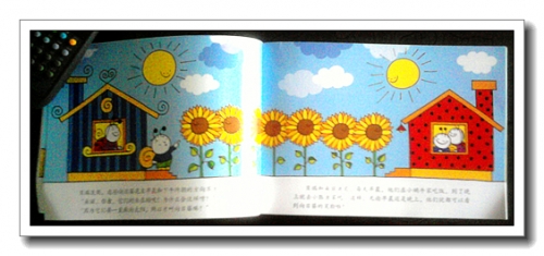 这个故事里告诉我们向日葵的花总是朝着太阳的,还画出了向日葵成长的过程。小蜗牛、小瓢虫、小蜜蜂的家都各有特点,婷和我仔细找着能代表他们特色的地方。婷特别关注向日葵的表情,再见的时候、伤心的时候、被包扎了微笑的时候。