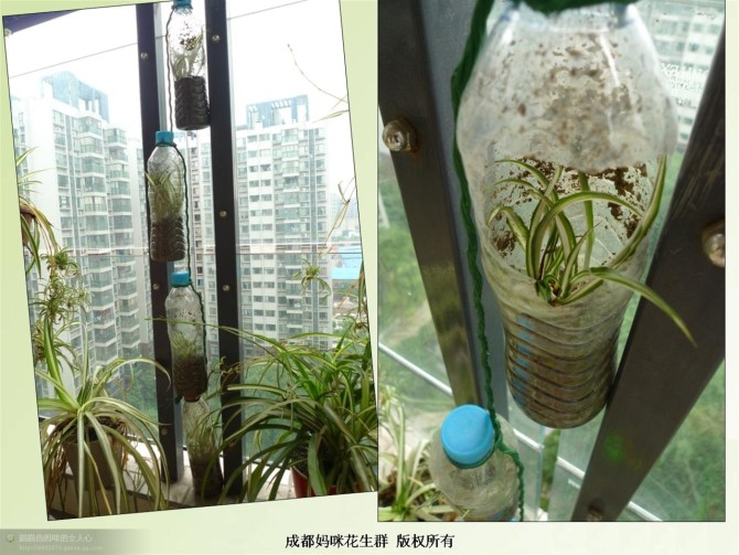 南阳暖暖 : 猫妈,瓶子那么高,如何给这些花花草草喝水哦? 猫鱼妈咪 : 阳台栏杆,很矮的。老外的这个是用的灌水系统,更科学,制作也更复杂。我觉得他们的瓶子壁中国的一般瓶子更大。