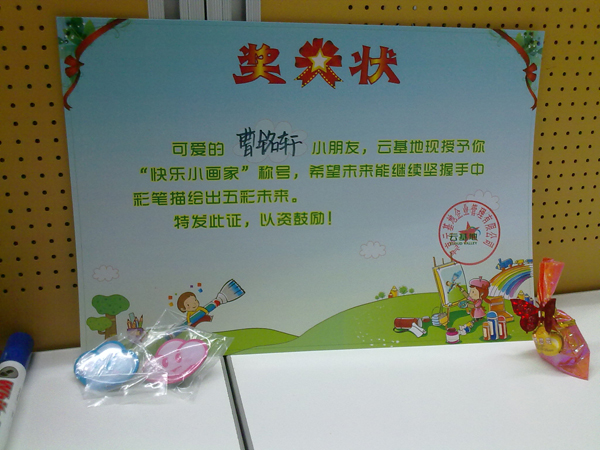 今晚回家给宝宝颁发奖状!!让孩子高兴下,他前几天还惦记这事呢,问画吉祥物的情况。这下有交代了