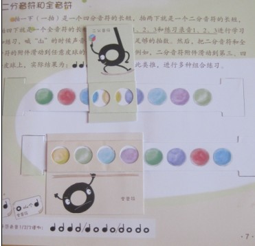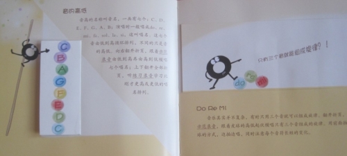 这本书的新颖性在于有立体手工可以让孩子感受音符的跳动,跳动的过程就是颜色变化的过程,也可能是形状变化,也可能是高矮变化,总之能感受到活的音符。通过听示范录音,做每一页的练习,认识四分音符,二分音符和全音符...,不同的音符用不同的形状。还有小游戏,比如耳朵迷宫,让孩子听各种事物的发音,并把音符写在书上,锻炼孩子的听辨能力。不仅有孩子们喜欢的迷宫,还有孩子喜欢的DIY,可以用设计的声音长短,自己创造一条属于自己的DIY作品。几种声音组合的变化,让自己的设计的音乐更丰富,孩子体验到了创造的喜悦。还有拍皮球的方式,边拍边唱,来模唱do re mi 组成的旋律,让孩子熟悉又增加长短音符的辨别,真是好玩的音乐。