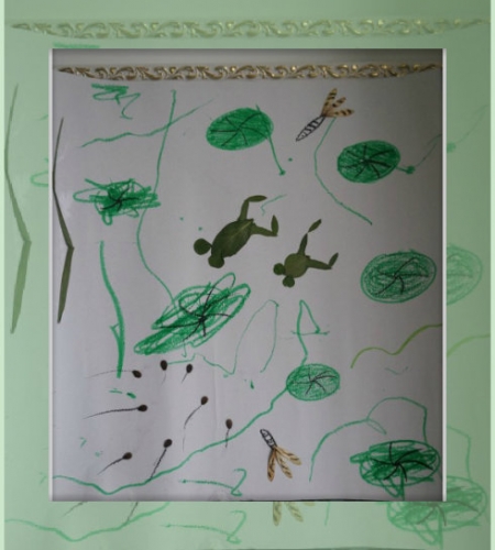 和儿子一起完成了下面这幅《小蝌蚪找妈妈》