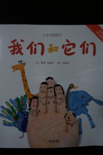和孩子在一起玩手指画的时候如何进行创作?最初,我只知道手指可以代替笔,沾上颜料在纸上随意得涂抹;再往后知道了用积木或者蔬菜的很截面可以作为印章,沾上颜料可以引出许多漂亮的形状;慢慢的,我发现整个手掌也可以作为手指画的模板,变化的手掌可以在纸上形成很多不同的造型,在此基础上再创作,就是一幅幅完美的画。但如何进行一次次完美的创作却给我这个妈妈出了大大的难题,似乎就没有其他更好的创作,直到我看到这本《我们和它们》,哇,大大的灵感接踵而至。可以说,这本书既是一个好听的故事,又是一本很好的手印画的亲子教程。