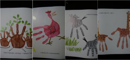 《我们和它们》,这本书讲述了一家人去逛动物园的故事。这家人好奇怪,就是一只手的五个手指头;这个动物园也好奇怪,从大门到天上飞的鸟、狮子、老虎、大象……竟然都是手印做成的。真的是创意无处不在!我记得我在将这个故事之前先问了宝宝:你看,书里的这一家人都是什么做的呀?宝宝回答:手。那你在看,书里的这些动物都用什么做的呀?宝宝回答:手。没错,一个再也简单不过的手,却能通过丰富的想象,赋予它变化万千的样子。我相信,无论对于我这个30岁的妈妈还是2岁多的宝宝来说,这些创意都深深地影响着我们。