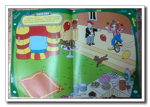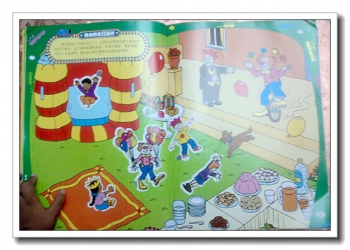 在贴之前,婷先让我给她讲故事内容,然后她指着好吃的说我要吃这个吃这个吃这个,指着游乐场说我要玩这个玩这个玩这个,弄得我头大不已,她却格格大笑。她小心得取下贴纸贴上去,书的纸质很好,不过贴纸的粘性太强,一旦粘上去,不太好重复撕贴,需要我的帮忙。我们一边贴一边讲,比如我说贴个小朋友吃蛋糕吧,婷贴好后我会说,看,这个小朋友好像在说:“哇!好多精美的食物啊!”气球旁边的那个孩子好像在说:“快看,杂技好精彩!”坐在垫子上的那个孩子好像在说:“好棒啊!再表演一个!”婷也跟我兴致勃勃地评论起来。