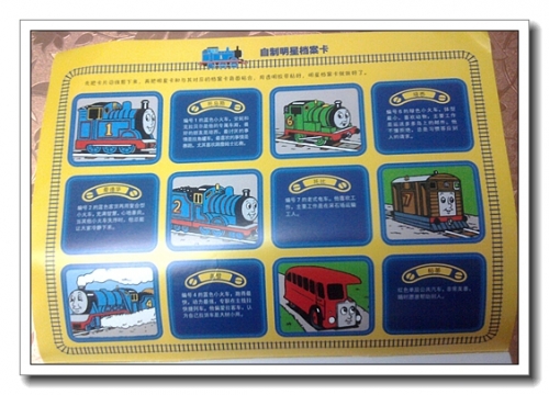 书A4大小,23页,有4近100个贴纸图案。封二和封三,是自制明星档案卡,可以沿着线把小火车剪下来,然后对应它的名字和它的简介,我一直对托马斯的朋友们的名字记不清分不清,这个正合适我用。