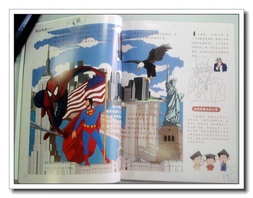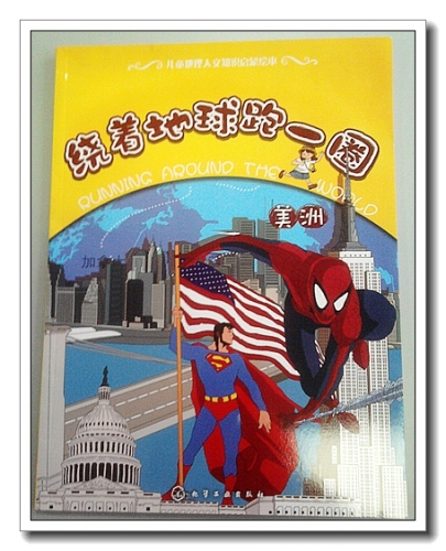选材很贴合孩子的认知范围,《美洲》这册,封面上绘制的就是著名的漫画、电影英雄超人和蜘蛛侠。