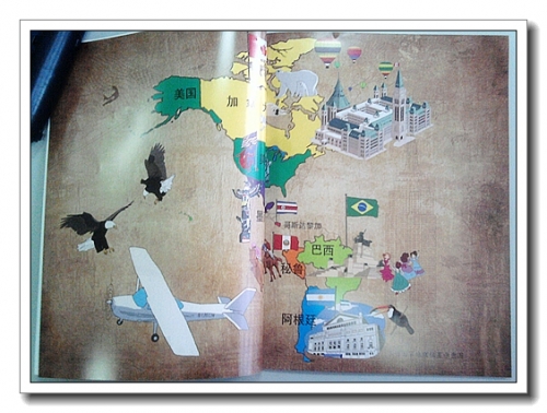 翻开扉页,是一幅美洲地图,选取的底色是复古色,很有点羊皮纸的感觉。仔细看,还有深色线条绘制的自由女神像等。用对比差异非常大的黄色和深绿色标出了美洲最大的两个国家——加拿大和美国,橙色、紫色、蓝色等标出了其他的国家,字体很大,地图上还有国家相应的国旗、知名建筑物、动物等。