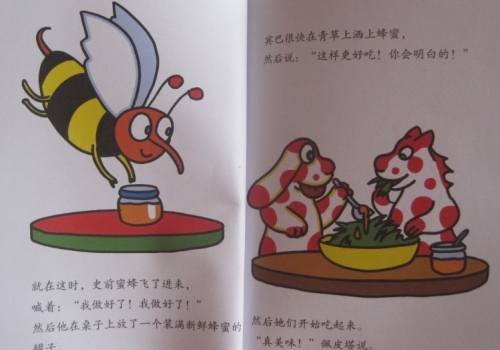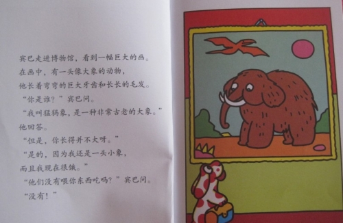 小狗宾巴已经是妞很熟悉的小主人公了。《小狗宾巴之畅游画中》一书介绍了小狗宾巴的在博物馆里的奇妙之旅。小狗宾巴畅游博物馆让妞很羡慕,一样的去博物馆,为什么小狗宾巴会有更多的收获呢?是什么让妞如此羡慕小狗宾巴呢?哦,原来是小狗宾巴做到了进入画中,曾经也是妞奢望的。如果到陈列的画中走一趟,那该多美呢。小狗宾巴走进博物馆,看到了一张巨大的画,画中一个像大象的动物居然能跟它打招呼,并邀请它到画中,是不是很神奇哦?这个看似像大象的动物是大象的最先哦,交猛犸象。小狗宾巴到画中,可以四处溜达,走着走着遇到了一只巨大的蜜蜂,这个蜜蜂是史前蜜蜂,居然不会采花蜜,还是小狗宾巴教得它如何采蜂蜜呢。看来蜜蜂也不是天生就会采蜜的,要通过学习才掌握好的本领的。小狗宾巴又遇到了史前兔子,兔子居然吃石头,小狗宾巴建议它尝尝一种草,这种草就是胡萝卜呢。小狗宾巴还遇到了史前恐龙,这个恐龙跟宾巴长得很像,都穿斑点衣服,跟他一起去他们家,并邀请她吃青草,拌着蜂蜜吃真是好吃呢。小狗宾巴还见到了恐龙的主人,原始人,看图感觉原始人跟阿曼多长得很像呢。阿曼多就是小狗宾巴的主人哦。并跟蜜蜂、恐龙合影留念,真是一个难以想象的旅程呢。