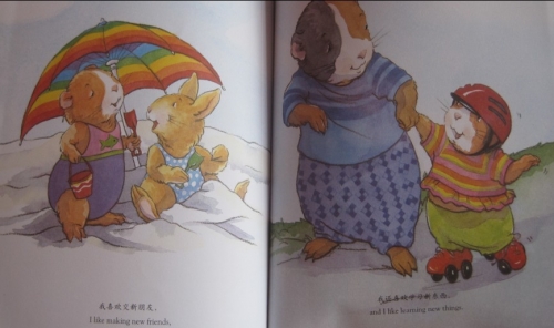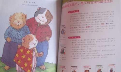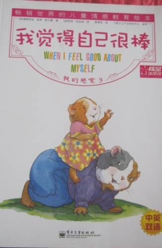 《我的感觉之我觉得自己很棒》是畅销世界的儿童情感教育绘本中的一本,是中英双语的,这本书中主要描述了小天竺鼠在“我很棒”的自信心态下,敢于和其他人不一样,感觉独立做事,明白了不用跟每个人都是好朋友,不必事事都争第一,不必是最好的,只要尽最大努力就行。记得有一次妞就反应,她确实不喜欢某个小朋友,我就告诉她不可能每个人都喜欢,也不可能要求每个人都喜欢你,要看到别人的长处,学习别人的优点,虽然孩子不能一下子就都懂了,慢慢地会理解的。这本书是大画面少字体,每页就一句中文,一句英文,画面都是非常温馨的,母子欢乐时光,亲子时刻,很生动,很吸引人。