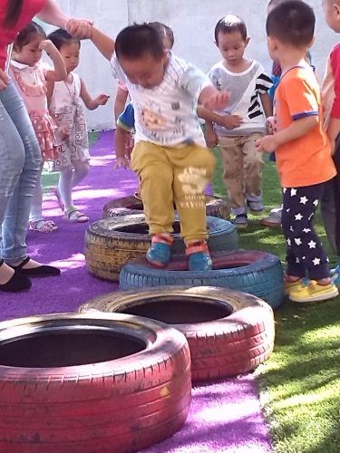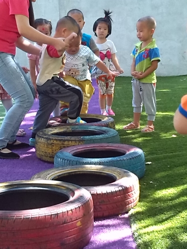 从孩子8月5日入园后我就不知道他每天在幼儿园每天是怎么度过的,昨天突然想在园外看看,一开始的时候我还躲着孩子的目光,可还是让他看到了我,他跑到幼儿园的栅栏边给我说:“妈妈你走吧。”我说:“我想看看你是怎么表现的》”,他就好乖的跑去玩了。 老师组织女孩去拿独轮推着玩,男孩就玩车的橡皮外轮胎,先是让他们滚着跑,接下来是把轮胎放到,小朋友从轮胎上走,掉下去的就要被大灰狼给吃掉。